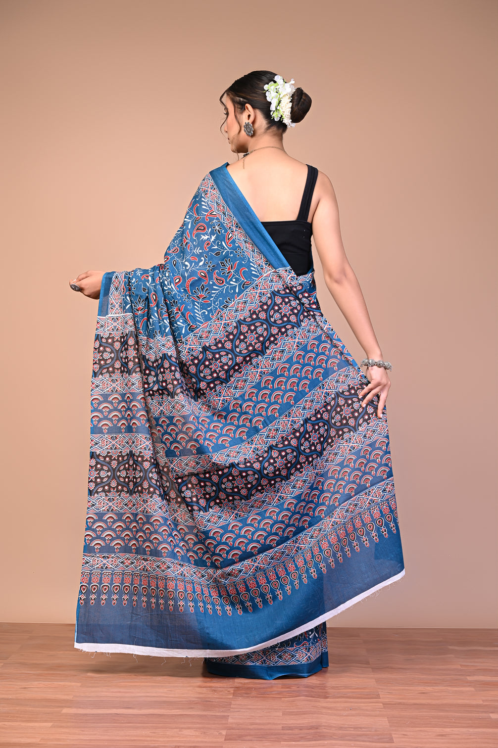 The Teal Garden is the saree for the woman who blooms wherever she stands — a rich teal canvas covered from hem to horizon in swirling red and white Ajrakh paisleys, trailing vines and scattered florals, the pallu opening into a breathtaking arc of scalloped motifs and geometric border bands in deep navy and rust.