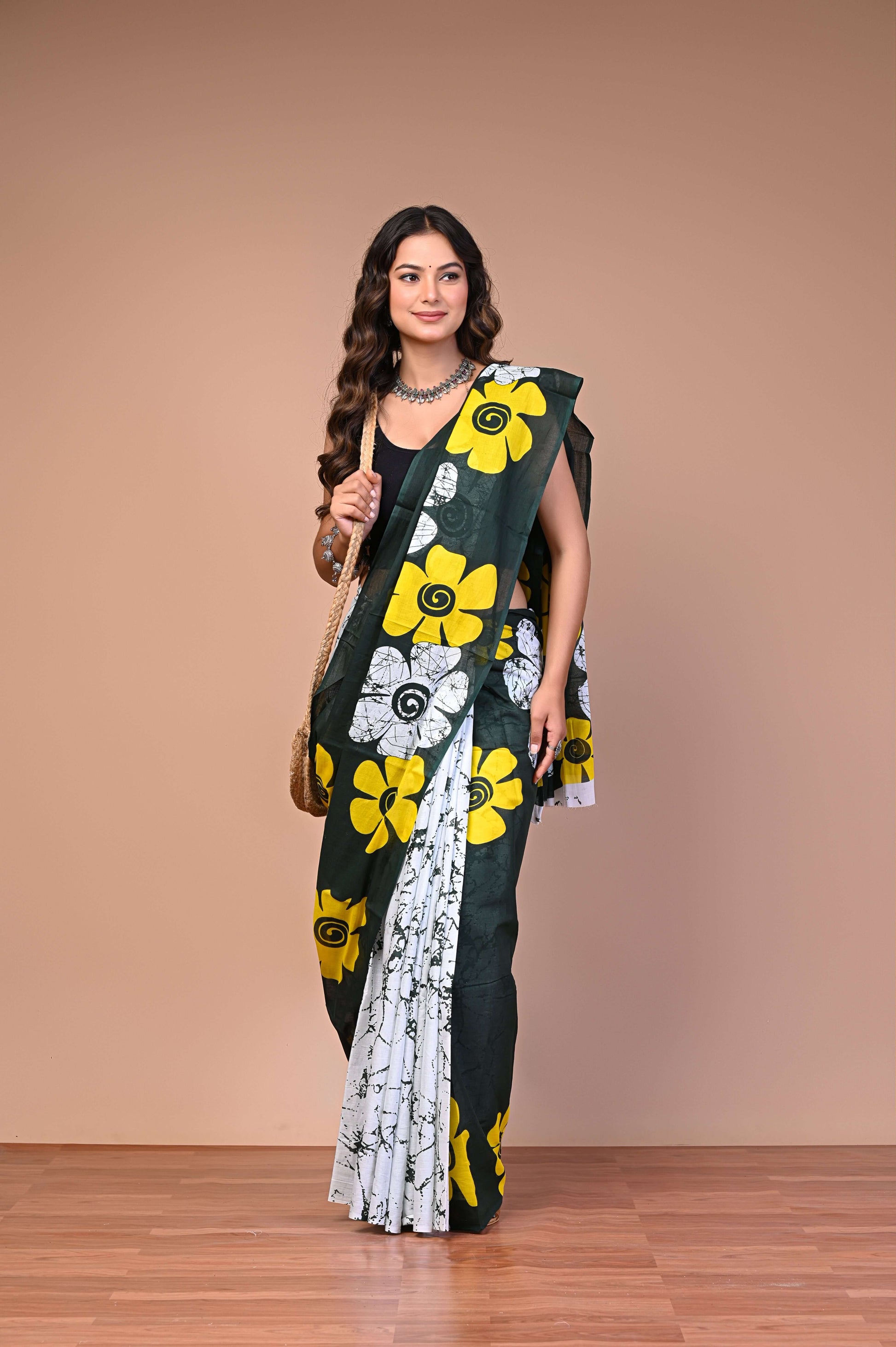 Step into timeless elegance with the Batik Printed Cotton Mul Saree by Printed Threads. Featuring delicate floral and geometric motifs inspired by batik artistry, this saree is crafted using fine screen printing for a refined, detailed finish.