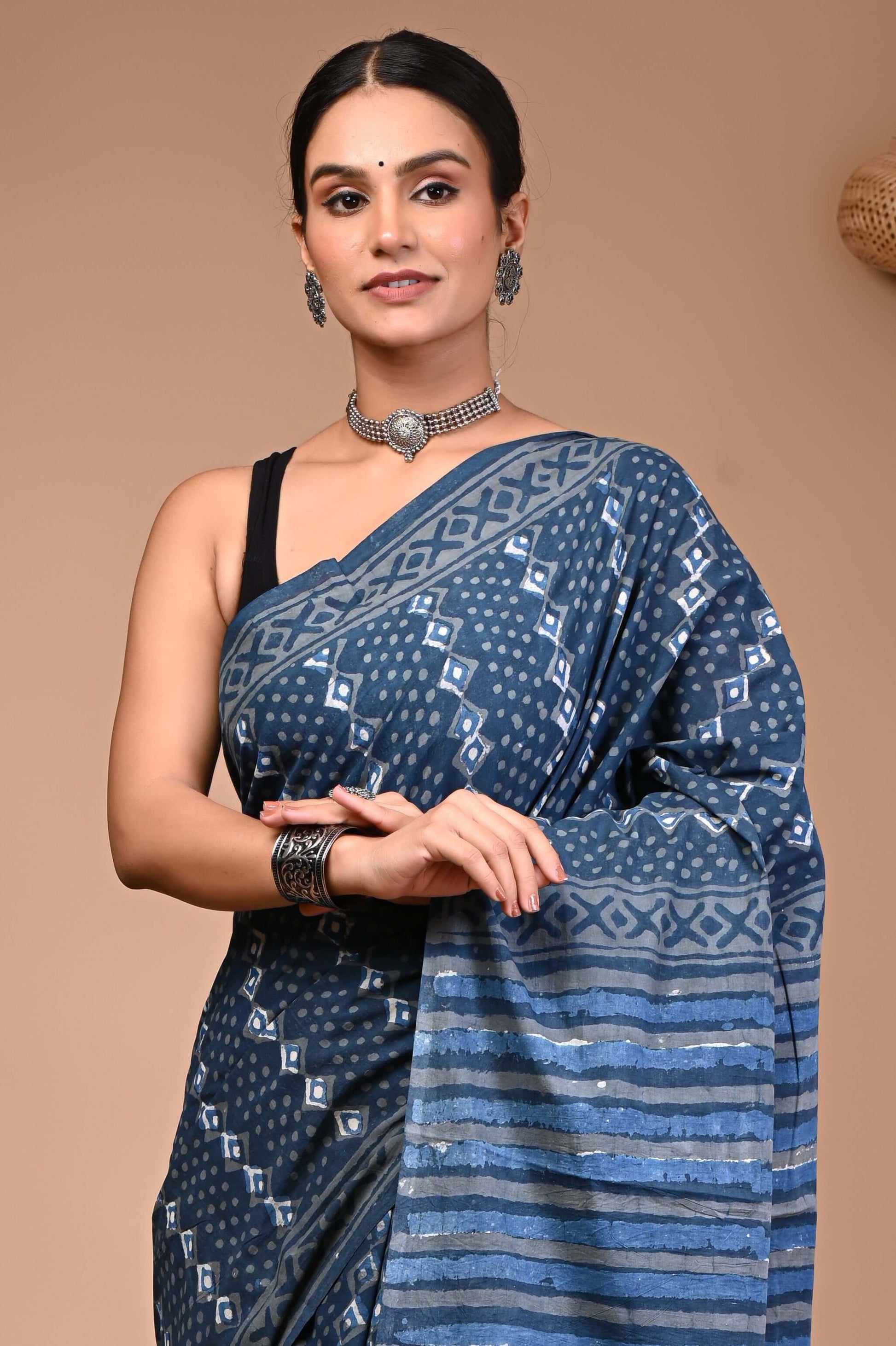 Drape yourself in timeless elegance with our Cotton Hand Block Printed Saree from Printed Threads. Crafted from soft, breathable cotton, this saree showcases the beauty of traditional hand block printing in deep indigo hues. The delicate floral motifs scattered across the body blend gracefully with the bold chevron design on the pallu, creating a perfect balance of tradition and style.