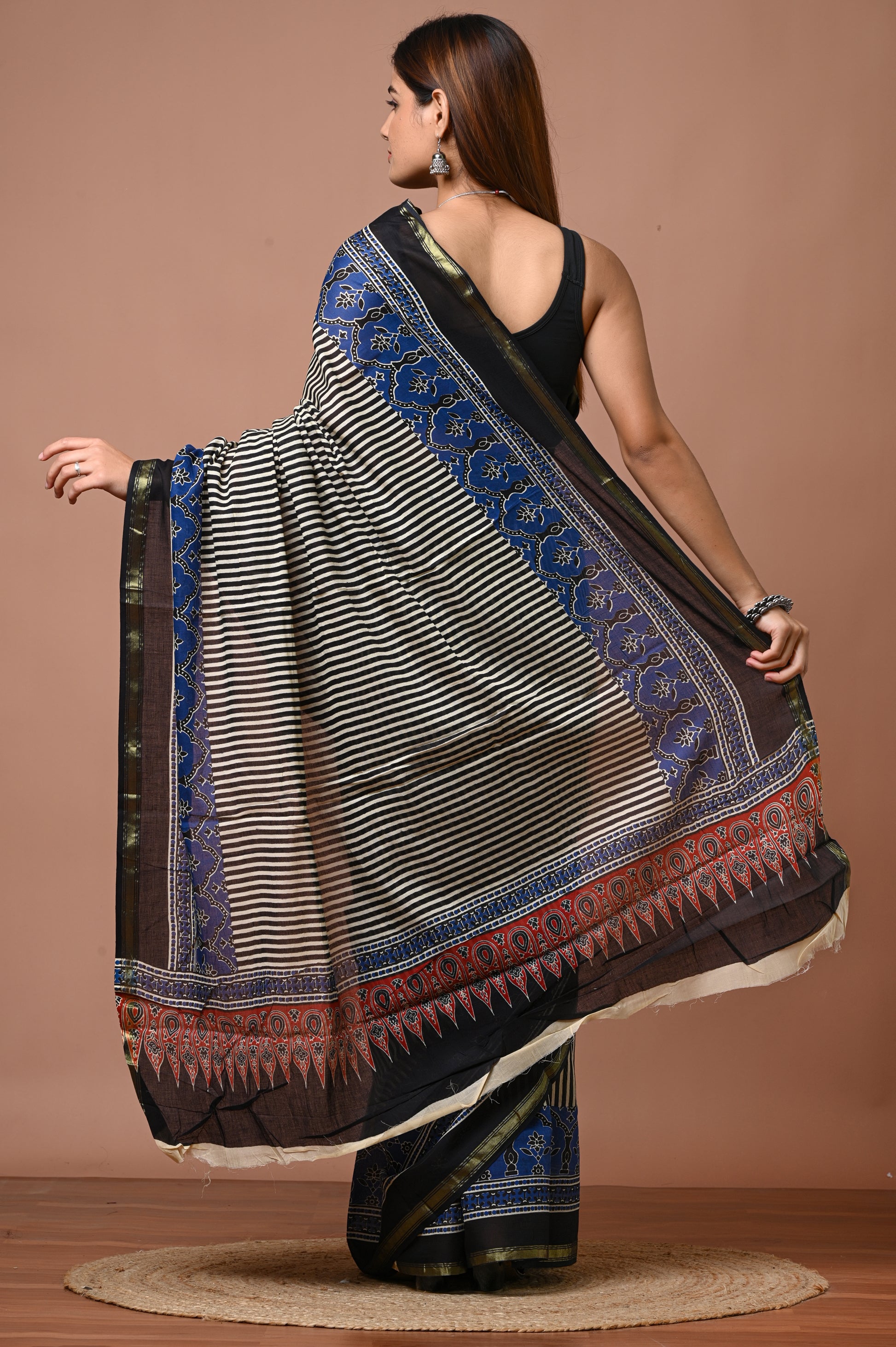 Elevate your ethnic wardrobe with this Pure Cotton Zari Saree, designed for women who love timeless elegance and everyday comfort. Crafted from high-quality breathable cotton, this saree features a beautiful zari border that adds a graceful festive touch while remaining lightweight and easy to drape.