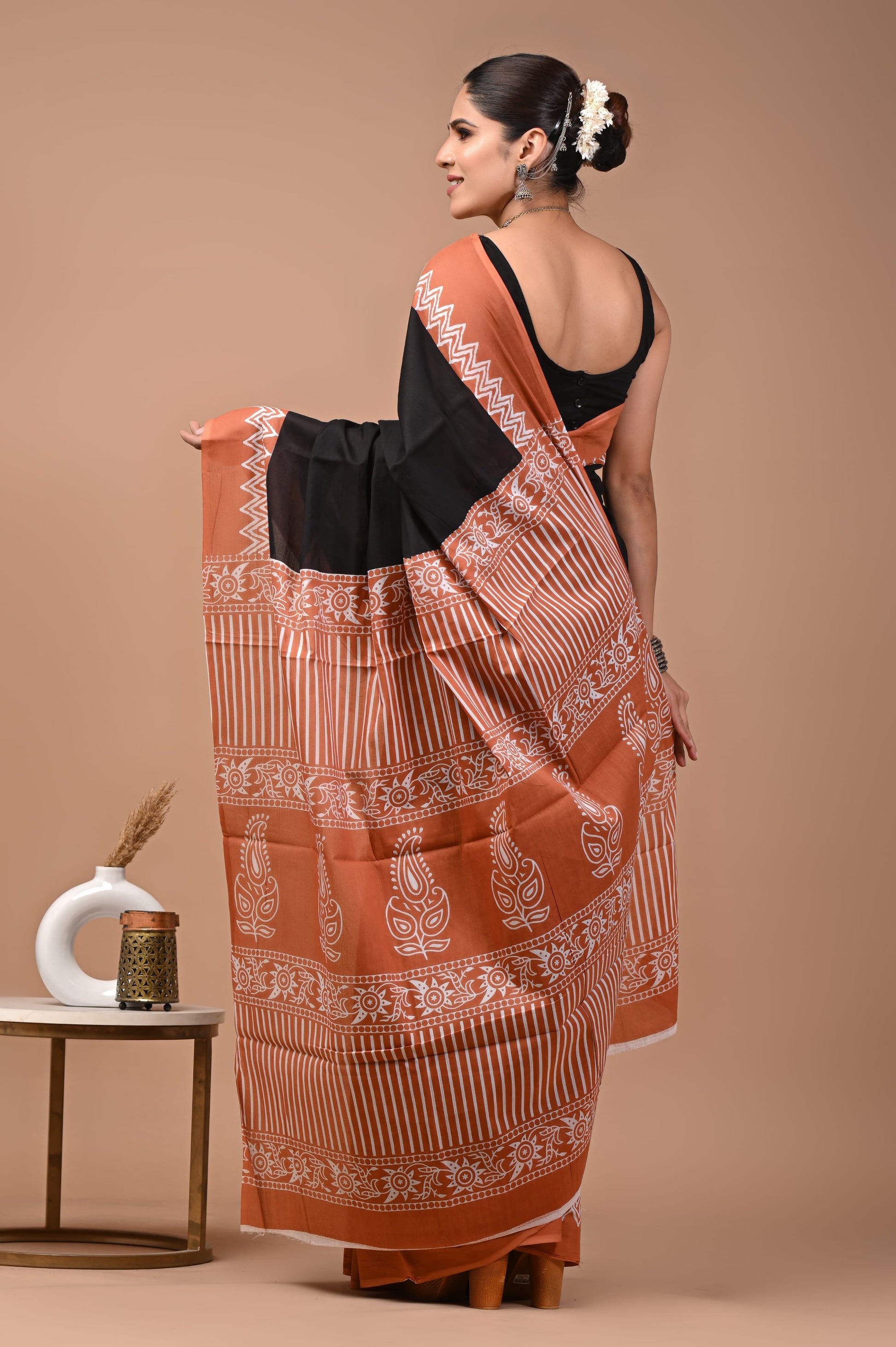 Hand Block Printed Cotton Mulmul Saree – Lightweight & Breathable