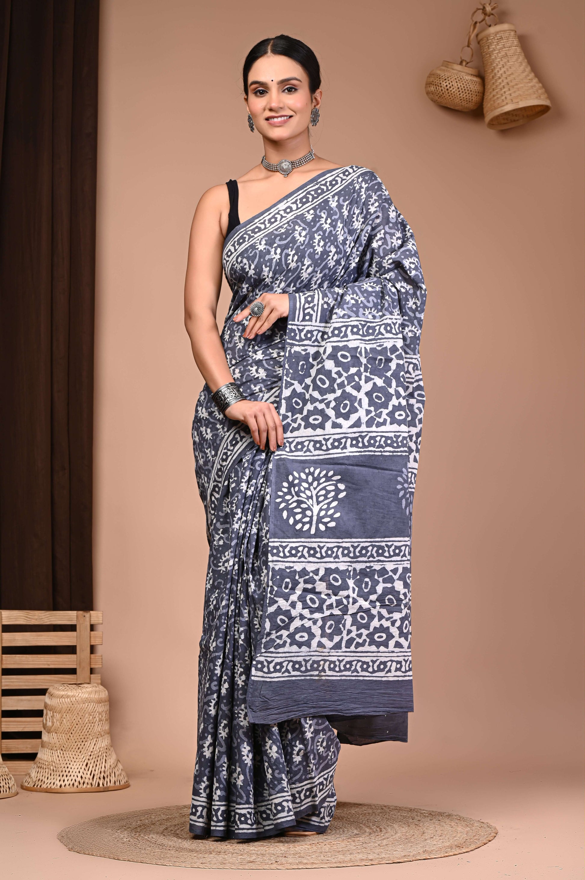 Drape yourself in timeless elegance with our Misty Grey Floral Dabu Print Cotton Saree from Printed Threads. Crafted from soft, breathable cotton, this saree showcases the beauty of traditional hand block printing in deep indigo hues. The delicate floral motifs scattered across the body blend gracefully with the bold chevron design on the pallu, creating a perfect balance of tradition and style.