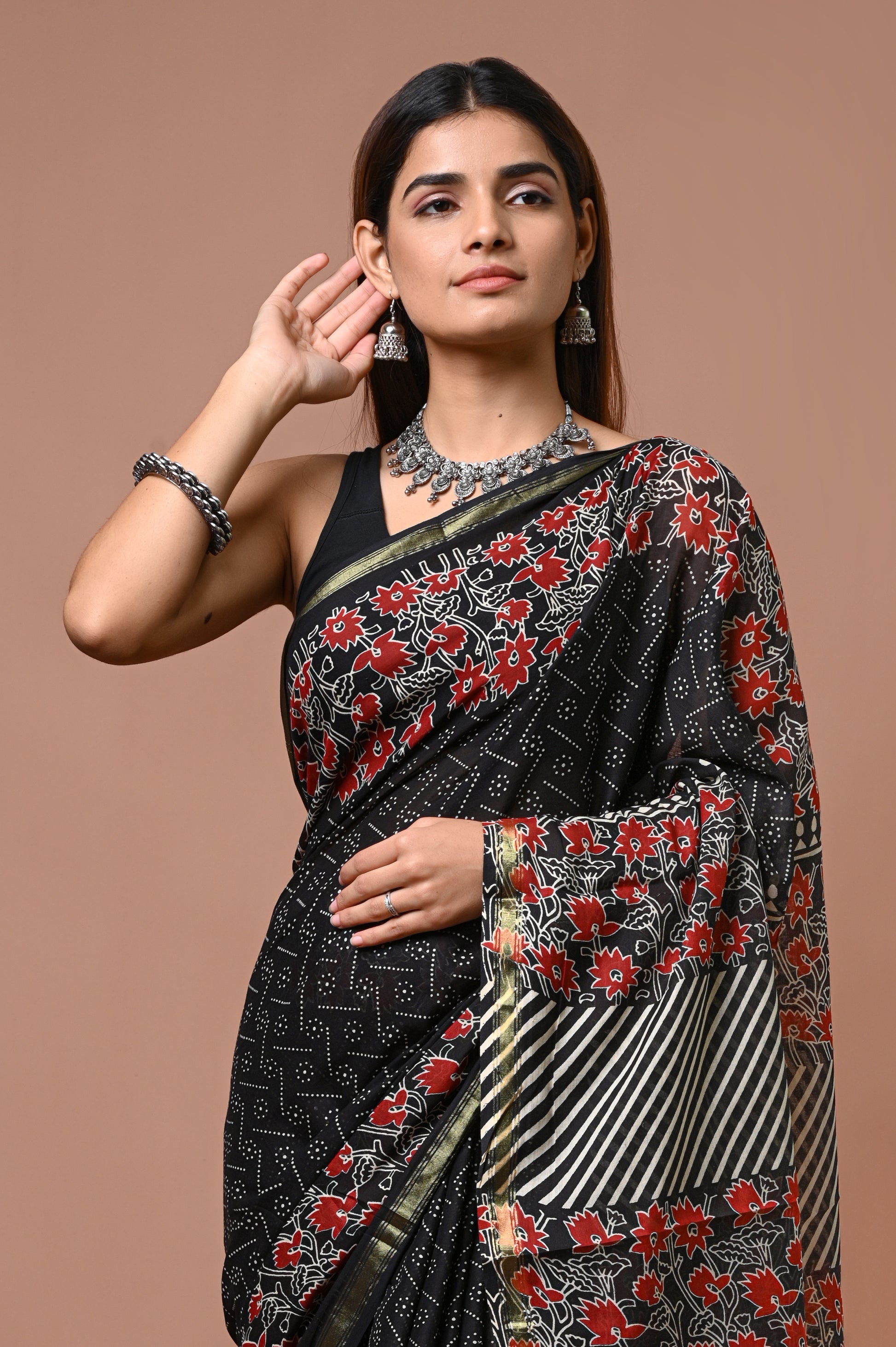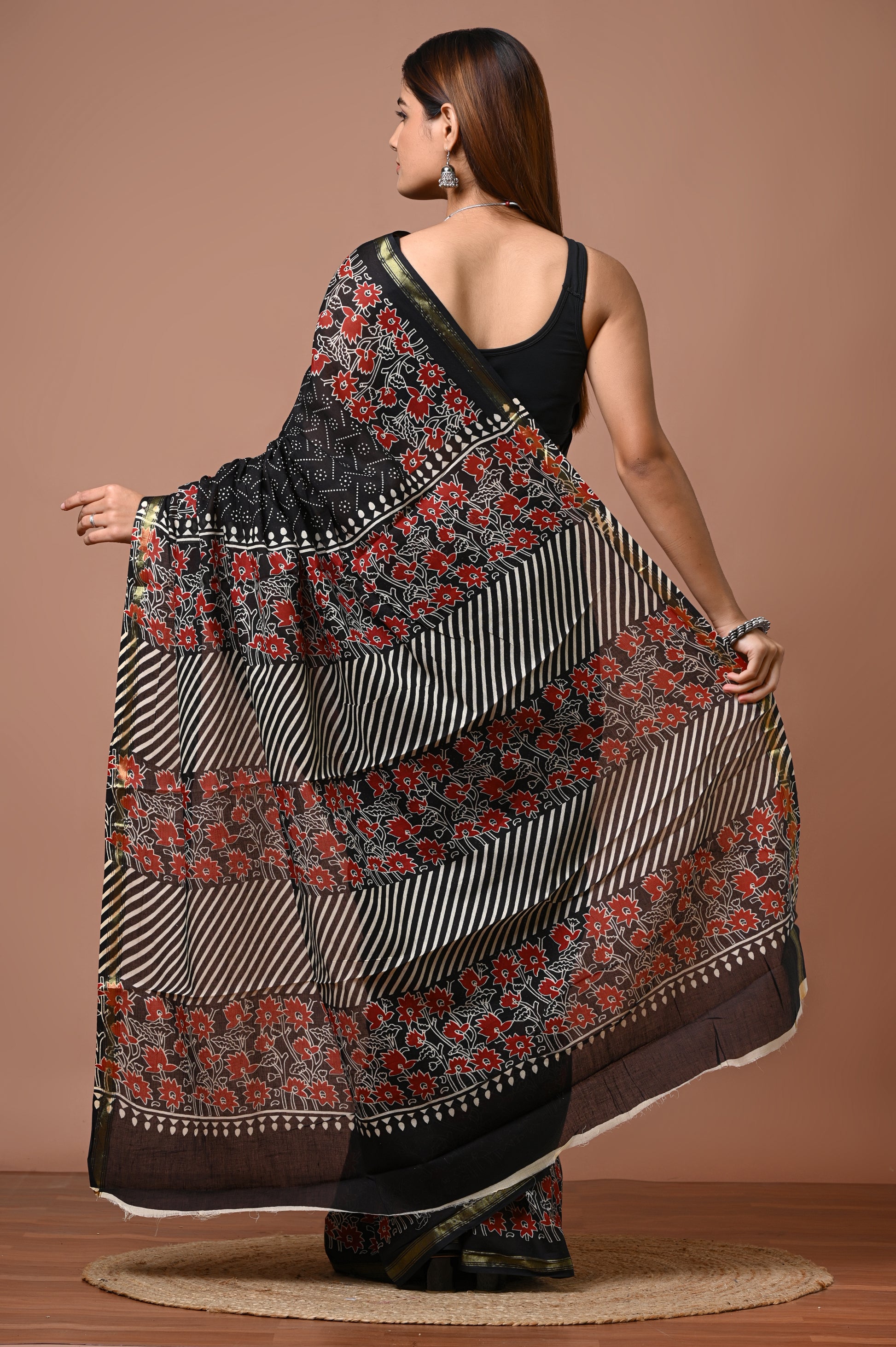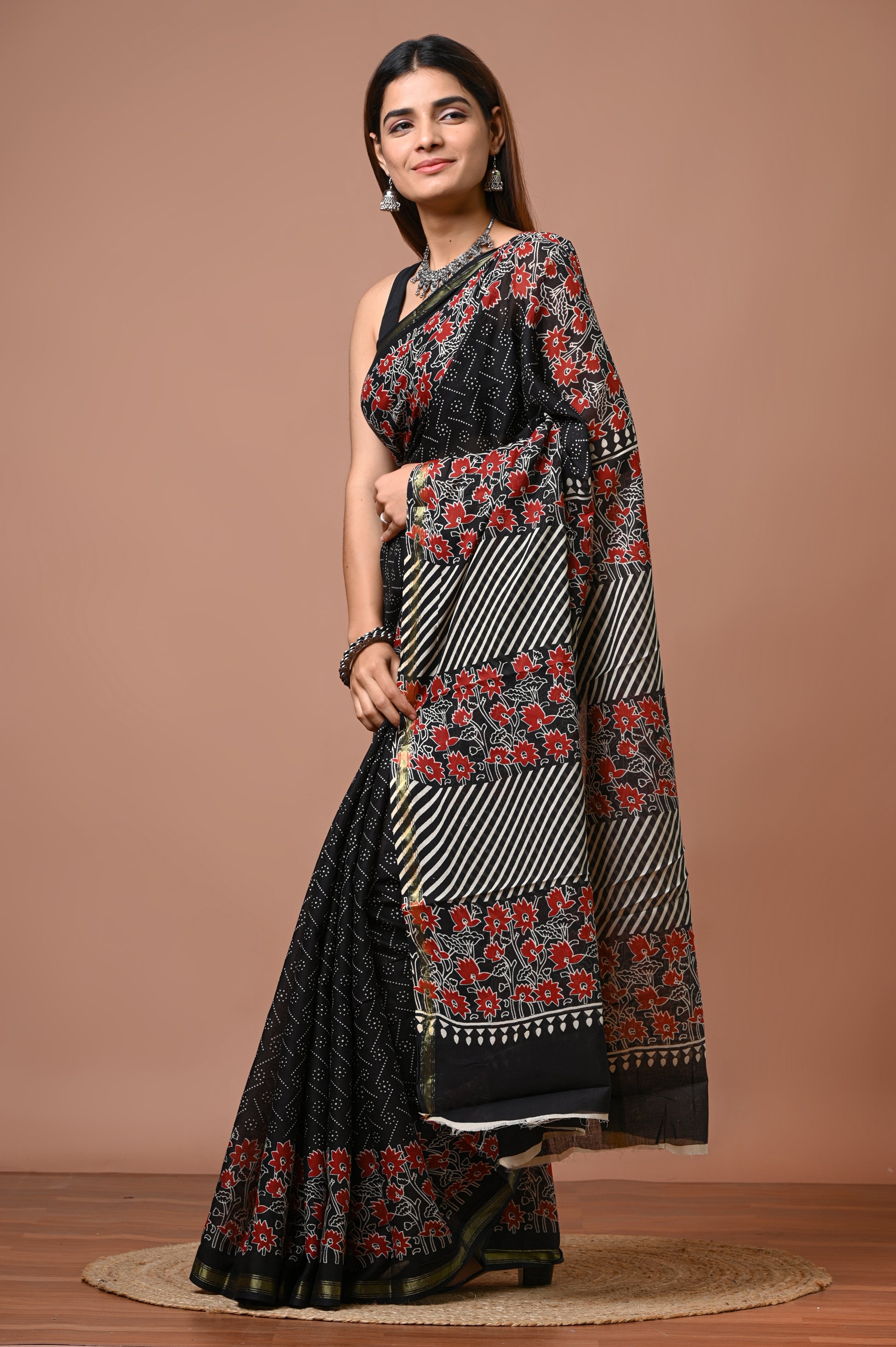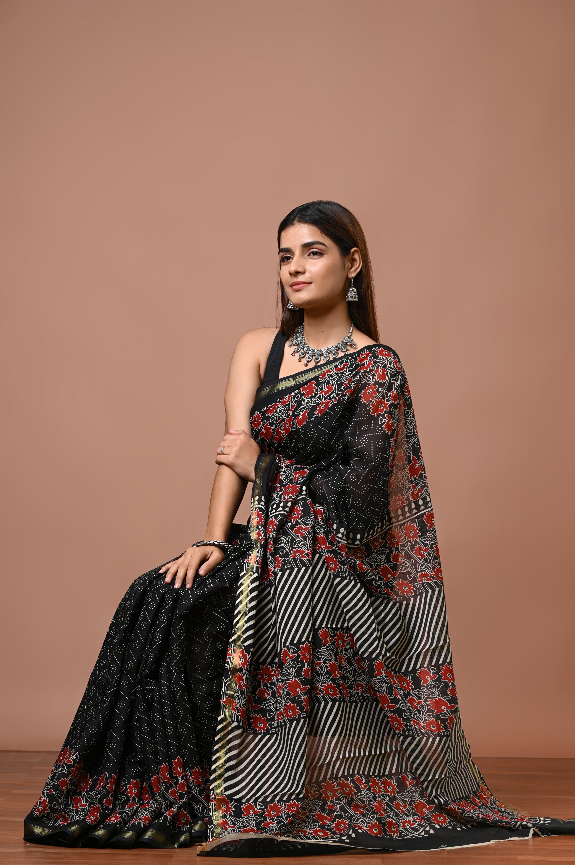 The Midnight Bloom is the saree for the woman who carries drama in every fold — a pure jet-black canvas alive with scattered white Bhandhej dot chevrons across the full body, the pallu exploding into bold red florals on a black ground, crisp black and white diagonal stripe panels creating a graphic contrast, and a delicate gold Zari border running the full length like a quiet signature of luxury.